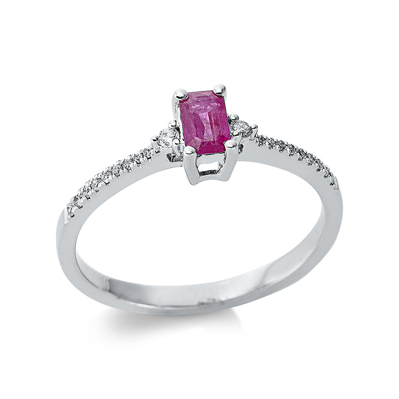 Ring 4er-Krappe 18 kt WG. 20 Brillanten 0.09 ct. TW-si. 1 Rubin 0.34 ct rot. Weite:54