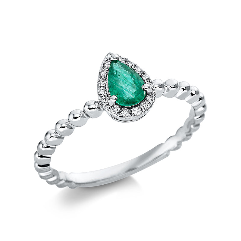 Ring 18 kt WG, 30 Brill. 0,43 ct, TW-vsi, 1 Smaragd 0,82 ct grün