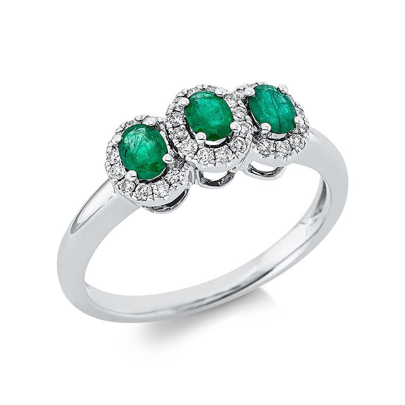 Ring 18 kt WG. 30 Brillanten 0.19 ct. TW-si. 3 Smaragde 0.47 ct grün. Weite:54