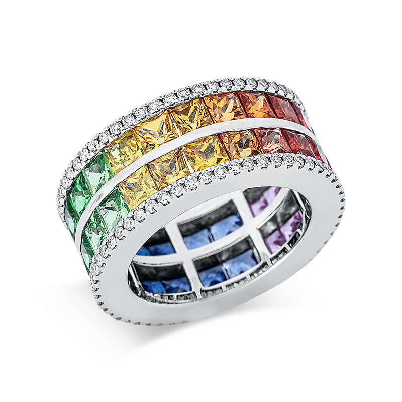 Ring 18 kt WG. 13 Brillanten 0.19 ct. TW-si. 13 Saphire 0.28 ct pink. 13 Saphire 0.24 ct blau. B:7.0 mm. Weite:54