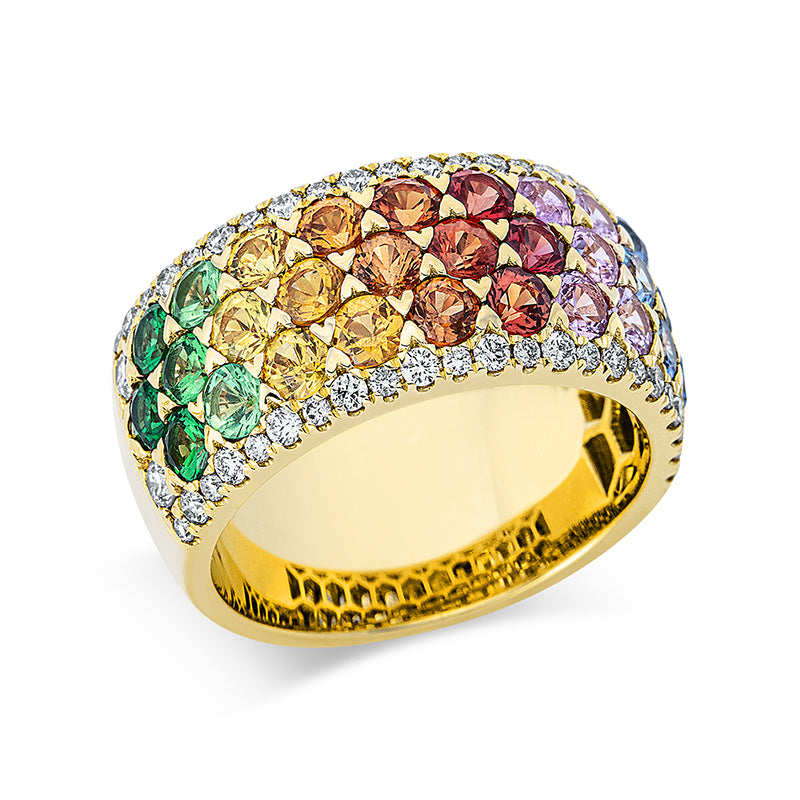 Ring 18 kt GG, 50 Brill. 0,62 ct, TW-si, 31 Saphire 3,48 ct multicolor
