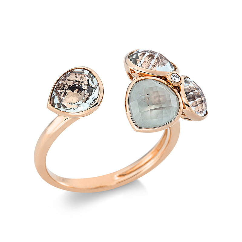 Ring 18 kt RG. 53 Brillanten 0.23 ct. TW-si. 3 Amethyste 6.10 ct grün. 1 Rosenquarz 0.80 ct rosa. Weite:54