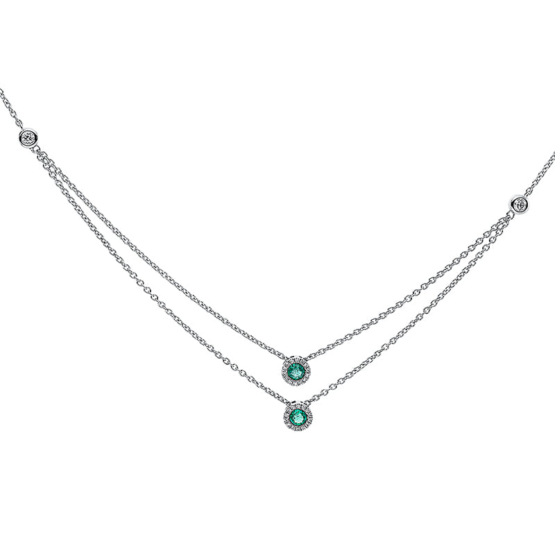 Collier 18 kt WG. mit ZÖ 40 cm. 2 Brillanten 0.08 ct. TW-si. 28 Brillanten 0.06 ct. TW-si. 2 Smaragde 0.23 ct grün. L:45.0 cm
