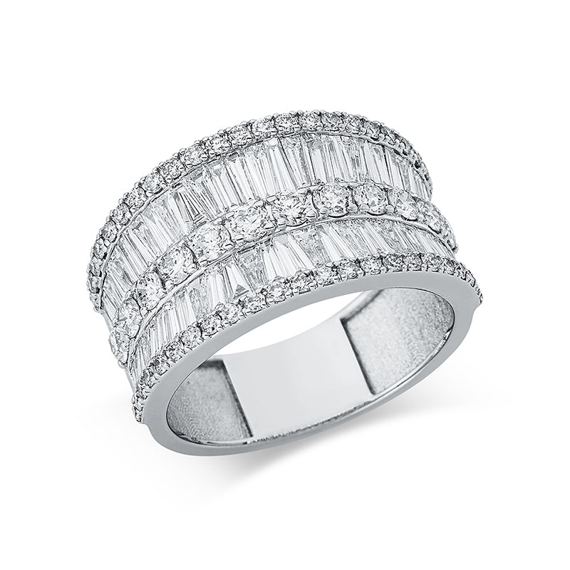 Ring 14 kt WG. 12 Brillanten 0.60 ct. F-vsi. 20 Trapeze 0.35 ct. F-vsi. 35 Trapeze 1.00 ct. F-vsi. 46 Brillanten 0.41 ct. F-vsi. Weite:55