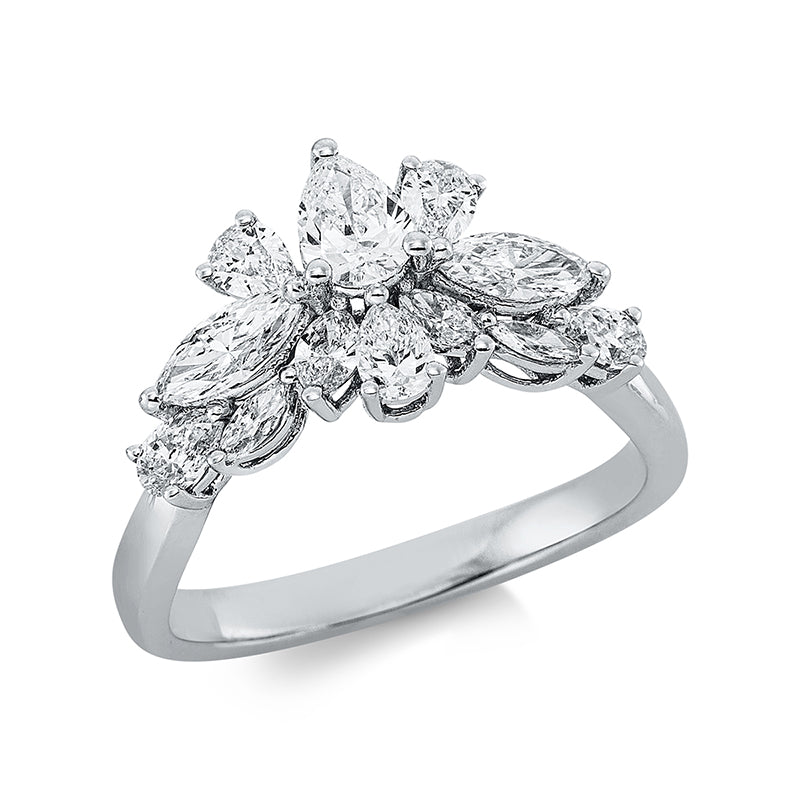 Ring 18 kt WG. 2 Navette 0.41 ct. TW-si. 6 Tropfen 0.85 ct. TW-si. 4 Navette 0.22 ct. TW-si. Weite:54