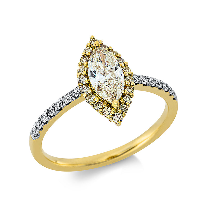 Ring 18 kt GG. 14 Brillanten 0.12 ct. W-pi. 1 Navette 0.58 ct. gelb. 18 Brillanten 0.16 ct. gelb. H:7.0 mm. B:13.1 mm. Weite:53