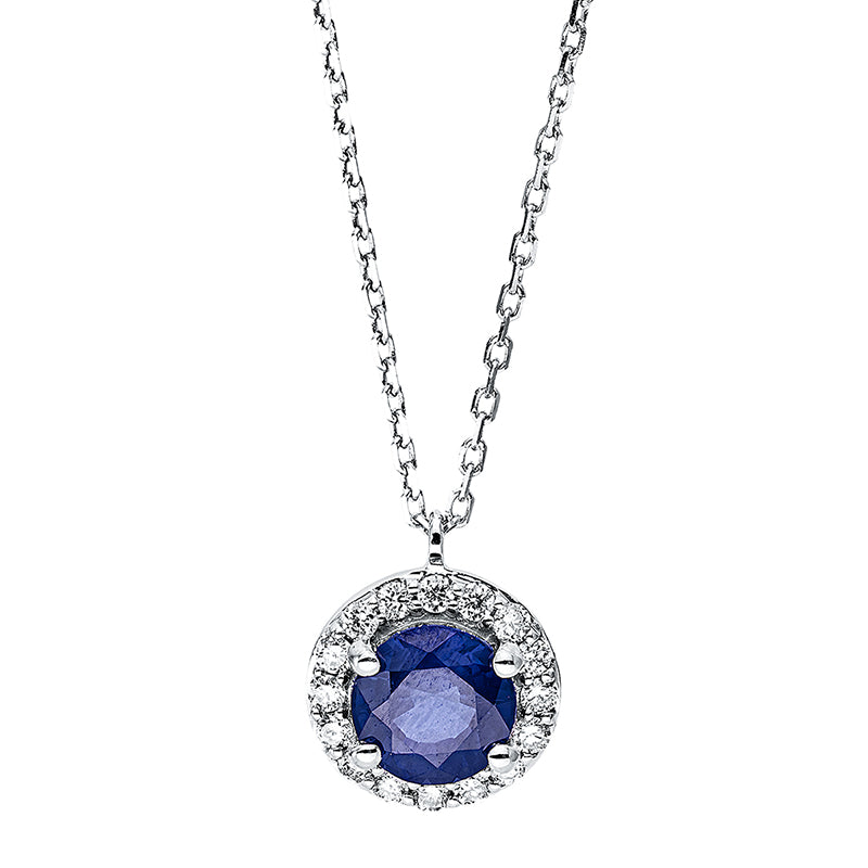 Collier 18 kt WG, mit ZÖ 40 cm + 42.5 cm, 14 Brill. 0,24 ct, TW-si, 1 Saphir 0,79 ct blau