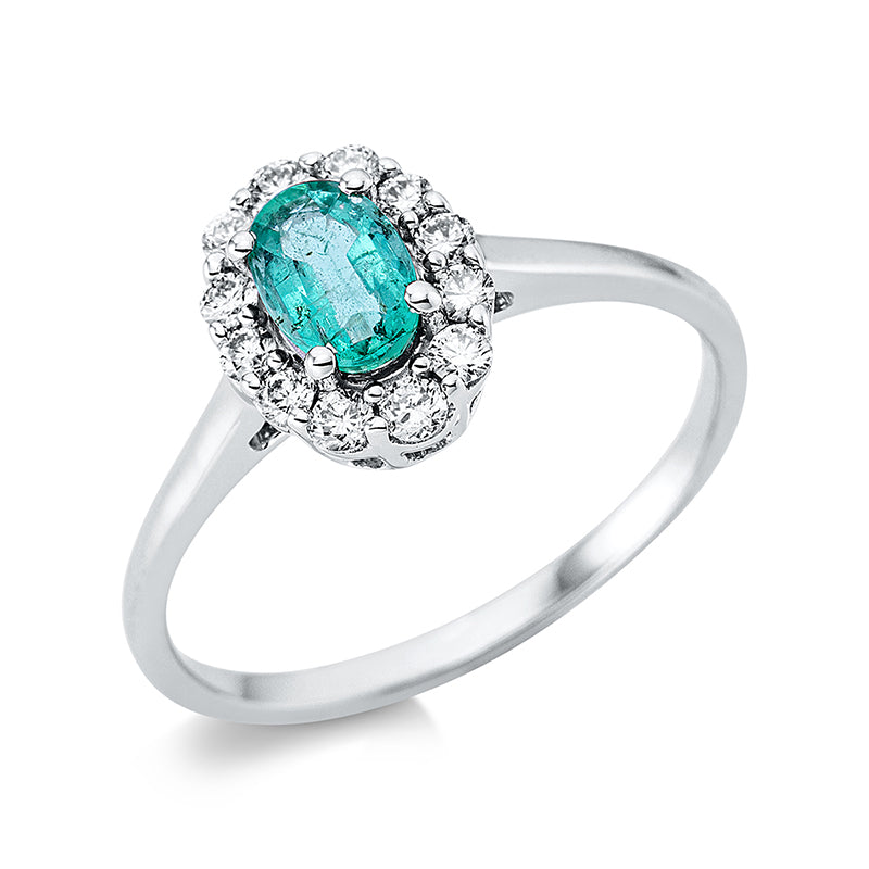 Ring 18 kt WG, 6 Brill. 0,11 ct, TW-si, 4 Brill. 0,09 ct, TW-si, 2 Brill. 0,05 ct, TW-si, 1 Smaragd 0,40 ct grün