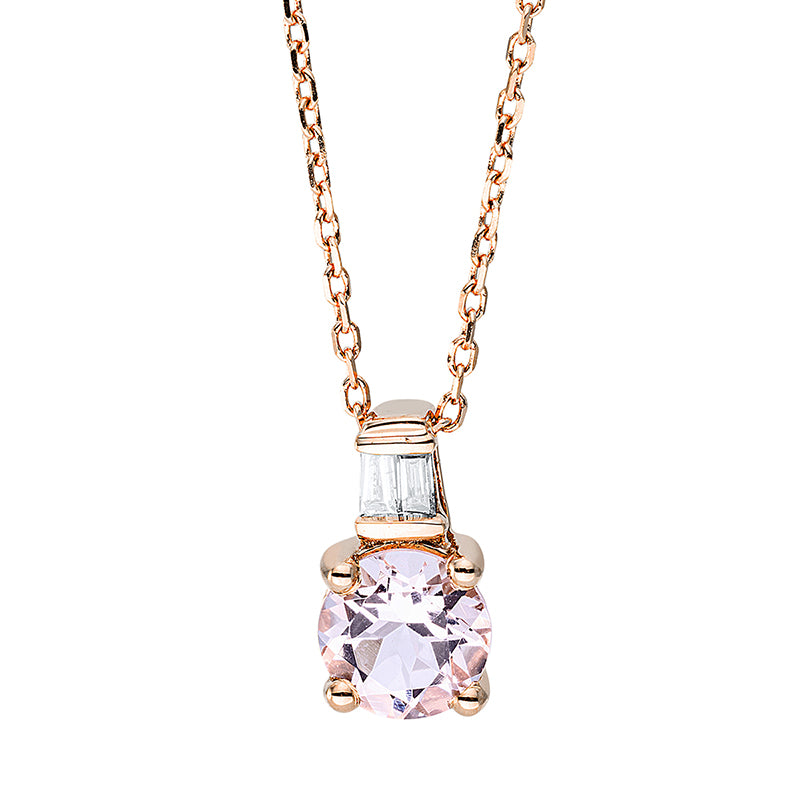 Collier 18 kt RG, mit ZÖ 40 cm + 42 cm, 8 Brill. 0,06 ct, TW-si, 4 Brill. 0,01 ct, TW-si, 8 Brill. 0,07 ct, TW-si, 1 Morganit 0,90 ct rosa