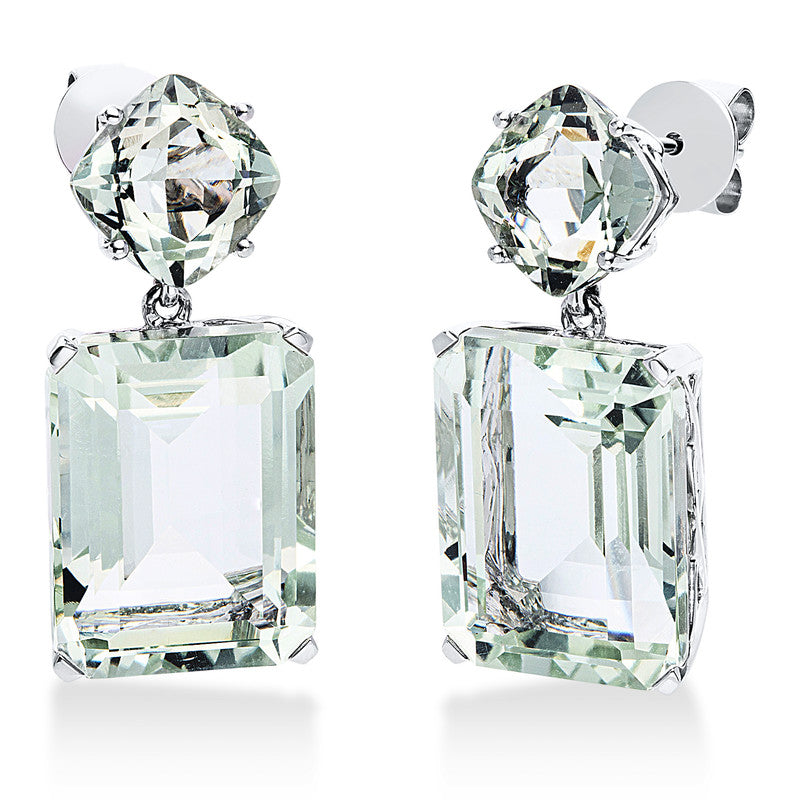 Ohrschmuck 4er-Krappe 18 kt WG. 2 Amethyste 4.40 ct grün. 2 Amethyste 24.60 ct grün. H:26.8 mm. B:11.9 mm