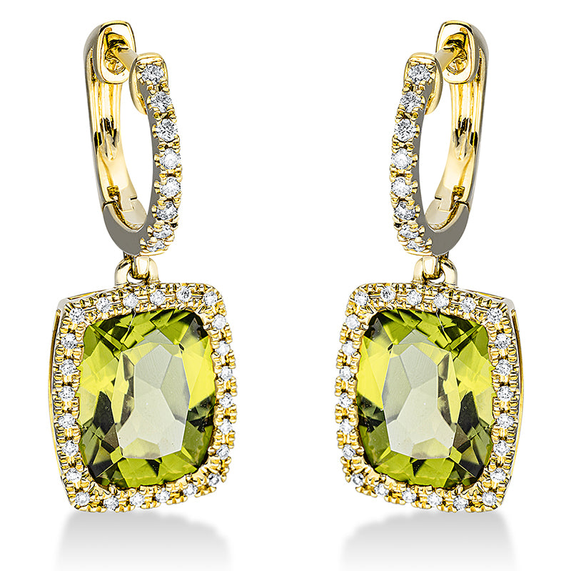 Ohrschmuck 18 kt GG. 64 Brillanten 0.30 ct. TW-si. 2 Peridot 6.70 ct grün. H:25.0 mm. B:10.0 mm. S:5.6 mm
