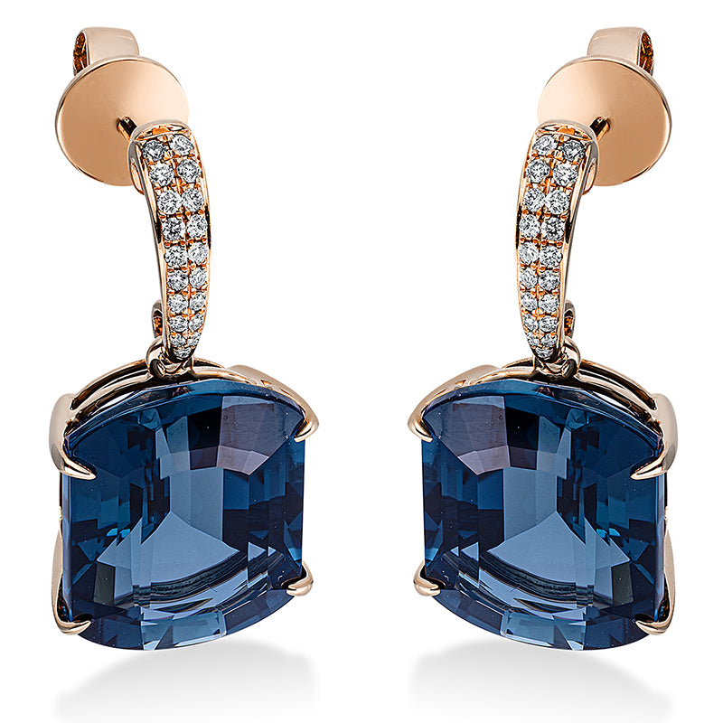 Ohrschmuck 18 kt RG, 38 Brill. 0,19 ct, TW-si, 2 Topase 21,10 ct Lond. blue