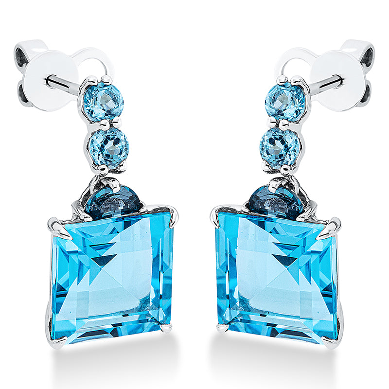Ohrschmuck 18 kt WG, 2 Topase 0,30 ct Lond. blue, 2 Topase 10,70 ct blau, 4 Topase 0,60 ct blau