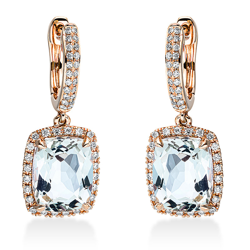 Ohrschmuck 4er-Krappe 18 kt RG. 92 Brillanten 0.33 ct. TW-si. 2 Amethyste 4.60 ct grün. H:23.7 mm. B:9.3 mm. S:4.9 mm