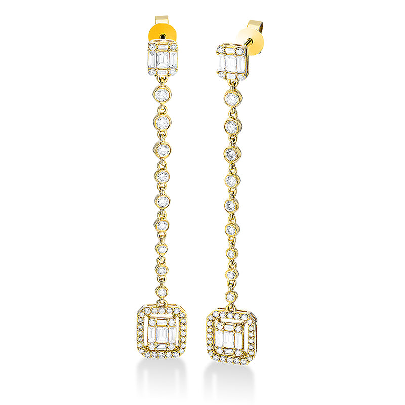 Ohrschmuck 18 kt GG. 6 Brillanten 0.20 ct. TW-si. 8 Baguette 0.06 ct. TW-si. 12 Baguette 0.40 ct. TW-si. 12 Baguette 0.40 ct. TW-si. 76 Brillanten 0.48 ct. TW-si. H:52.5 mm. B:8.1 mm. S:3.1 mm
