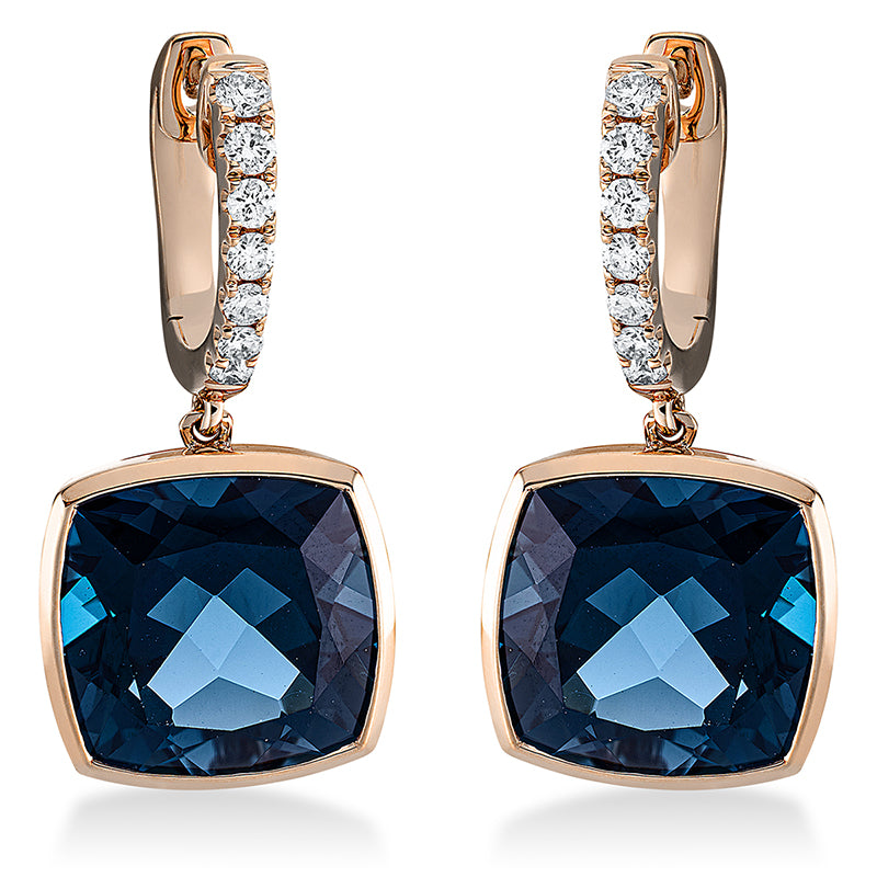 Ohrschmuck 18 kt RG. 14 Brillanten 0.19 ct. TW-si. 2 Topase 10.20 ct Lond. blue. H:22.8 mm. B:10.7 mm. S:6.1 mm