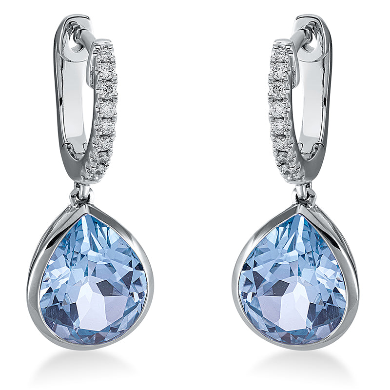 Ohrschmuck 18 kt WG. 18 Brillanten 0.12 ct. TW-si. 2 Topase 6.20 ct sky blue. H:23.0 mm. B:8.9 mm. S:5.6 mm