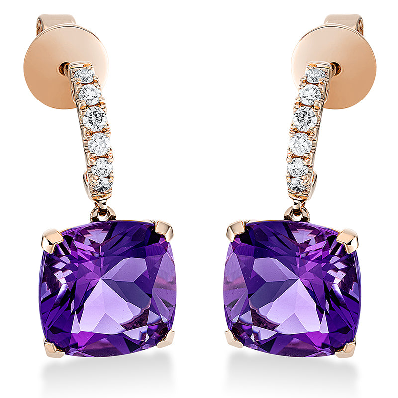 Ohrschmuck 4er-Krappe 18 kt RG. 12 Brillanten 0.23 ct. TW-si. 2 Amethyste 7.30 ct lila. H:21.4 mm. B:10.0 mm. S:6.1 mm