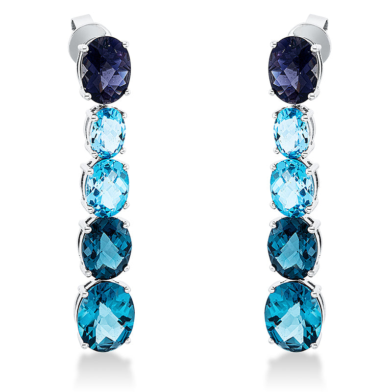 Ohrschmuck 18 kt WG, 2 Iolith 2,50 ct blau, 4 Topase 10,00 ct Lond. blue, 4 Topase 4,00 ct blau