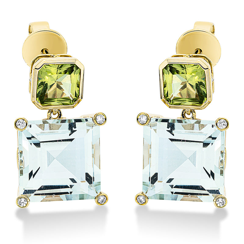 Ohrschmuck 18 kt GG, 8 Brill. 0,08 ct, TW-si, 2 Amethyste 13,80 ct grün, 2 Peridot 2,70 ct grün