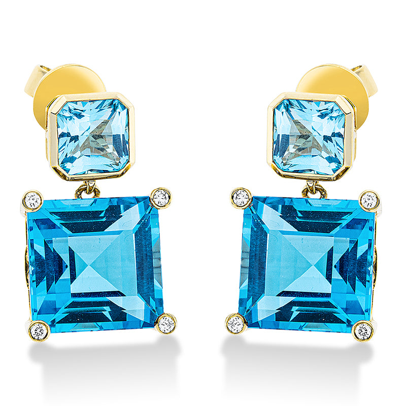 Ohrschmuck 18 kt GG, 8 Brill. 0,08 ct, TW-si, 2 Topase 16,90 ct blau, 2 Topase 2,90 ct blau