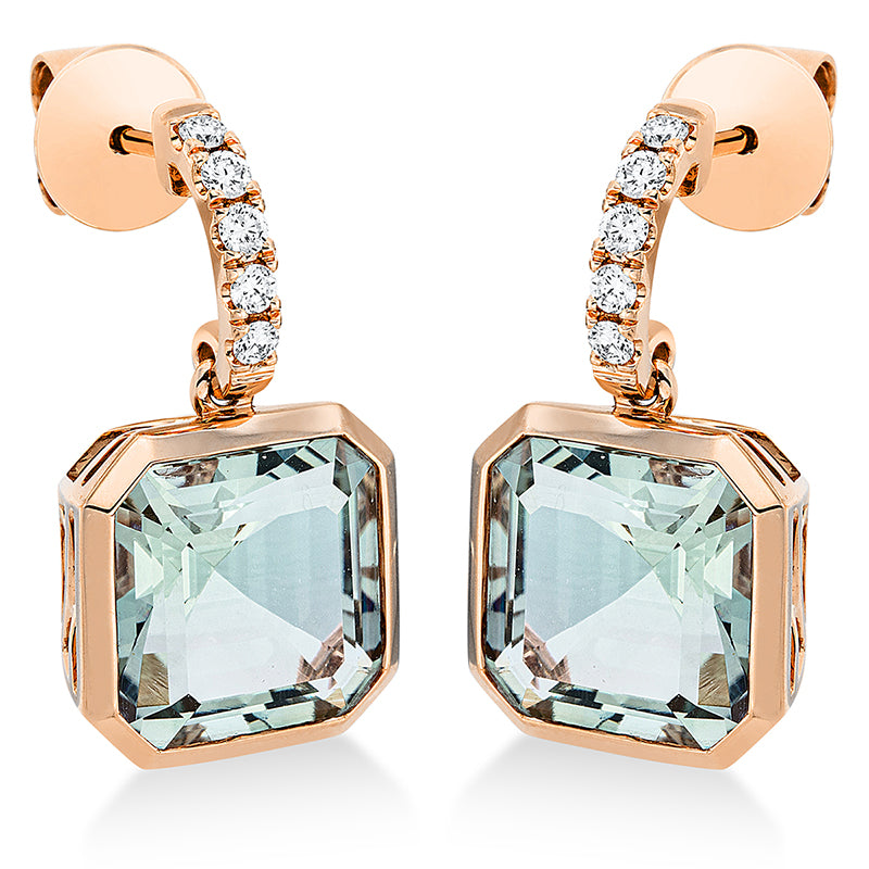 Ohrschmuck 18 kt RG. 10 Brillanten 0.23 ct. TW-si. 2 Amethyste 9.20 ct grün. H:21.7 mm. B:11.4 mm. S:6.4 mm