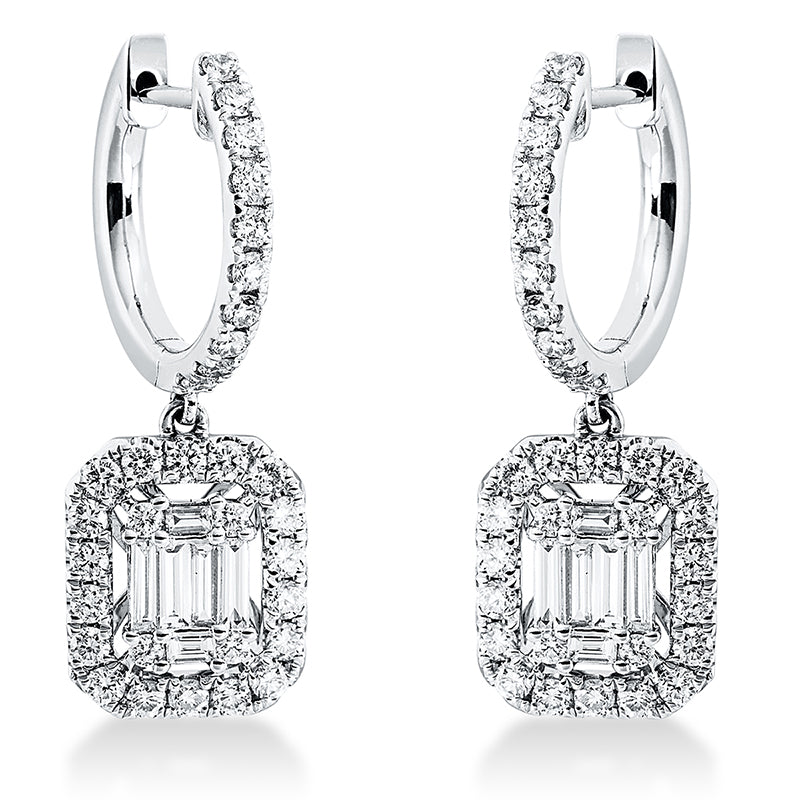 Ohrschmuck 18 kt WG. 12 Baguette 0.28 ct. TW-vsi/si. 64 Brillanten 0.79 ct. TW-vsi/si. H:25.5 mm. B:8.9 mm. S:4.1 mm