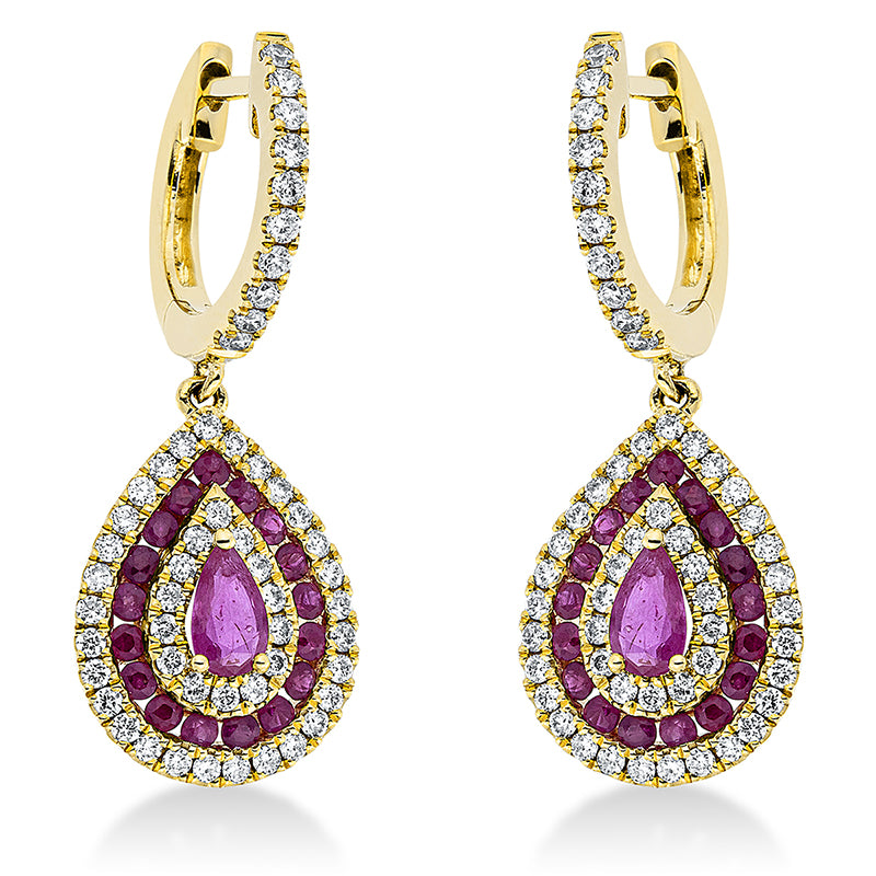 Ohrschmuck 18 kt GG Tropfen. 106 Brillanten 0.58 ct. TW-si. 1 Rubin 0.36 ct rot. 35 Rubine 0.51 ct rot