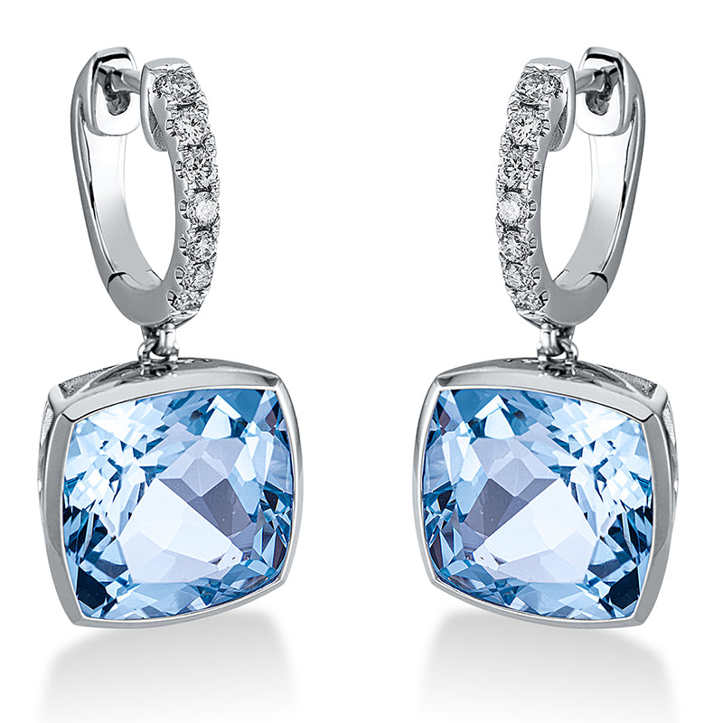 Ohrschmuck 18 kt WG. 14 Brillanten 0.19 ct. TW-si. 2 Topase 11.40 ct sky blue. H:22.8 mm. B:10.7 mm. S:6.1 mm