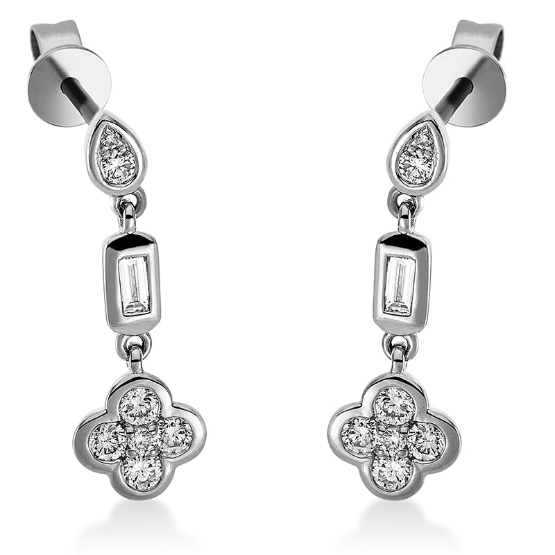 Ohrschmuck 14 kt WG, 4 Brill. 0,06 ct, F-si, 30 Bag. 0,72 ct, F-vsi, 60 Brill. 0,43 ct, F-si