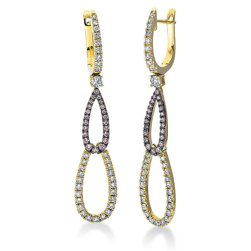 Ohrschmuck 18 kt GG, Fassung teils schwarz rhodinie, 66 Brill. 0,86 ct, TW-si, 44 Brill. 0,35 ct, braun