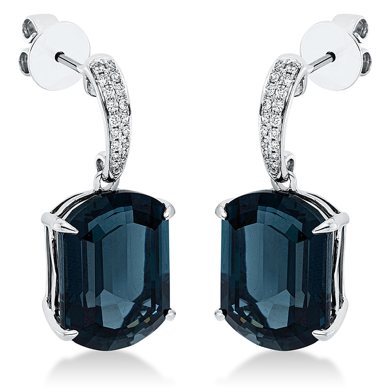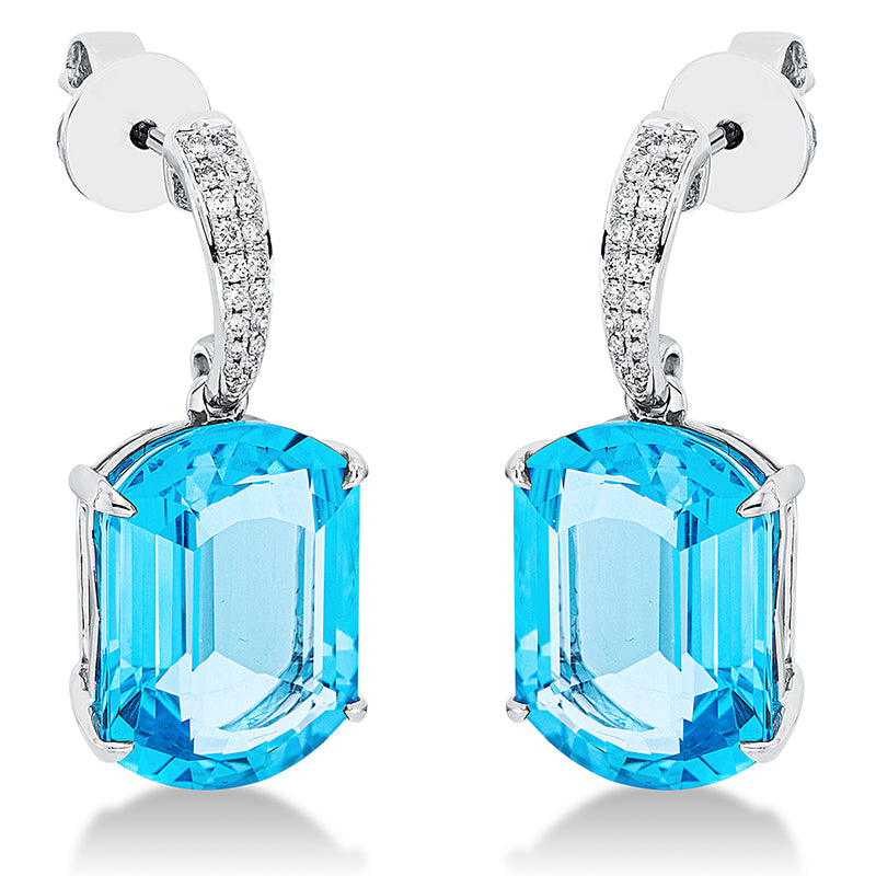 Ohrschmuck 18 kt WG, 38 Brill. 0,19 ct, TW-si, 2 Topase 18,60 ct blau