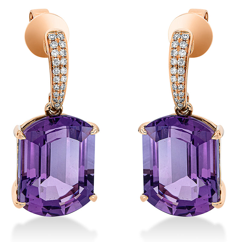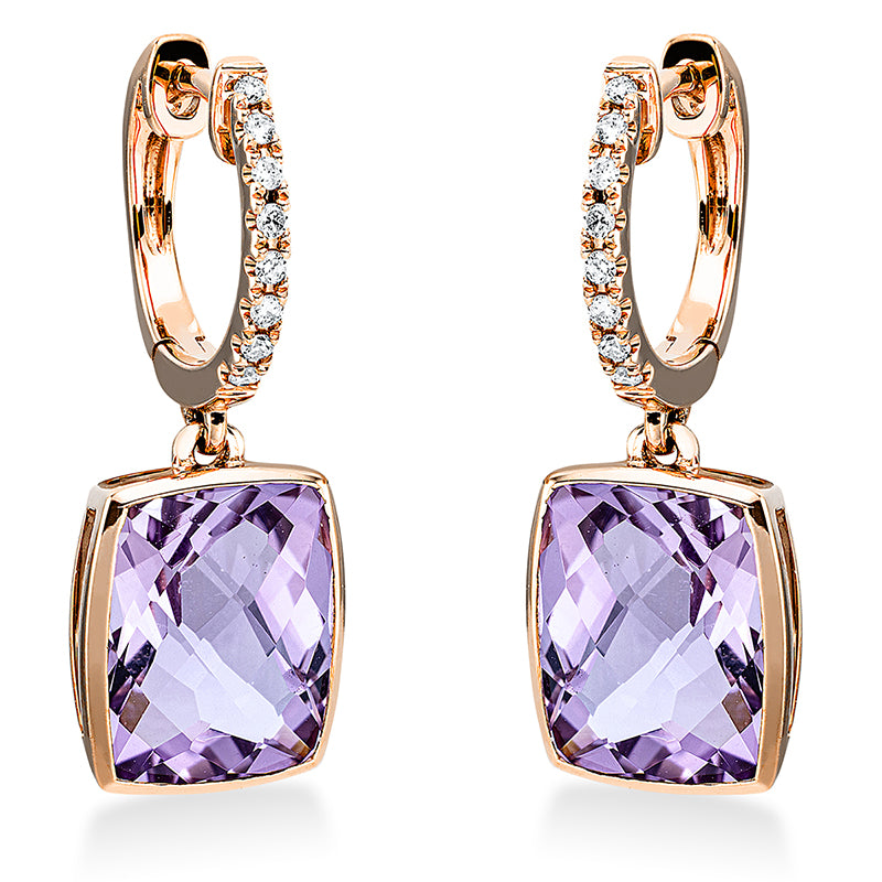 Ohrschmuck 18 kt RG, 16 Brill. 0,10 ct, TW-si, 2 Amethyste 6,10 ct lila