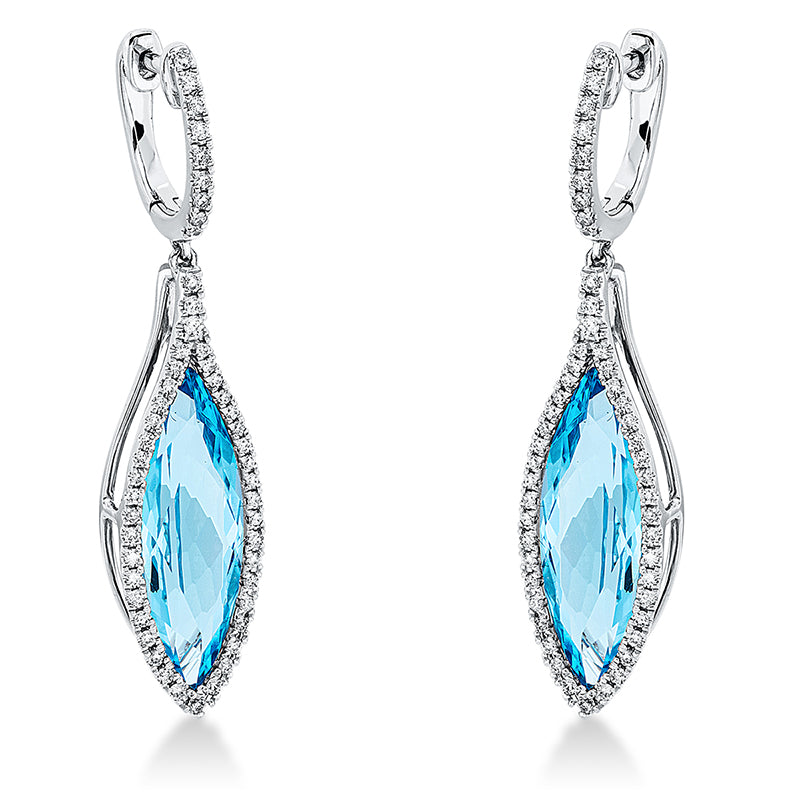 Ohrschmuck 18 kt WG, 102 Brill. 0,43 ct, TW-si, 2 Topase 7,20 ct blau