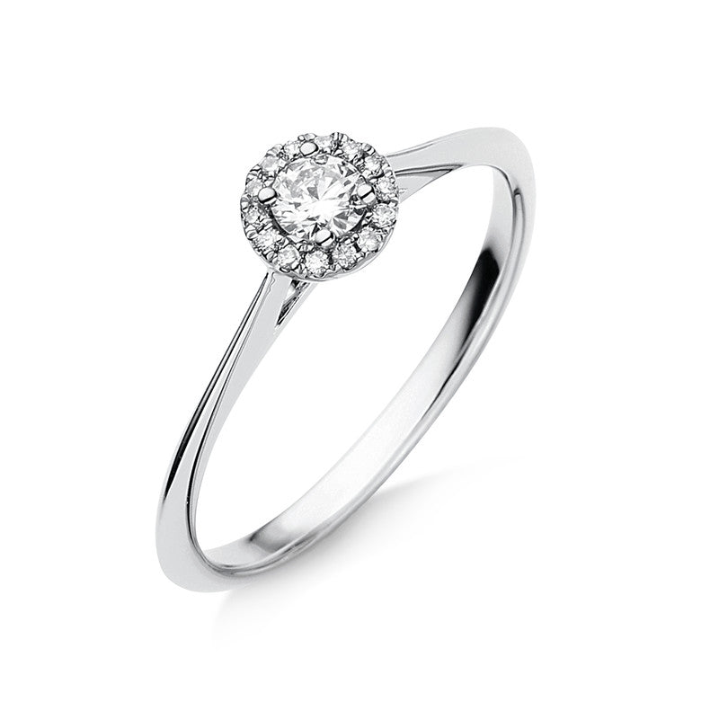 Ring 18 kt WG. 1 Brill. 0.13 ct. TW-si. 14 Brillanten 0.06 ct. TW-si. Weite:54