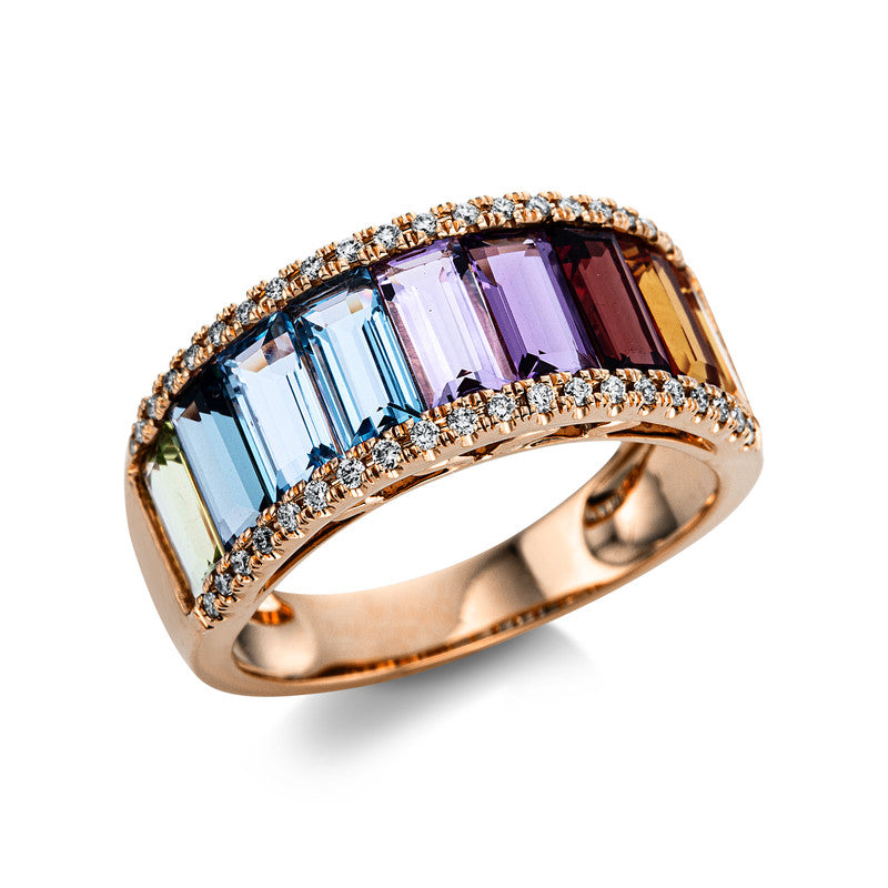 Ring 18 kt RG. 40 Brillanten 0.18 ct. TW-si. 9 Farbsteine 3.60 ct multicolor. B:8.5 mm. Weite:53